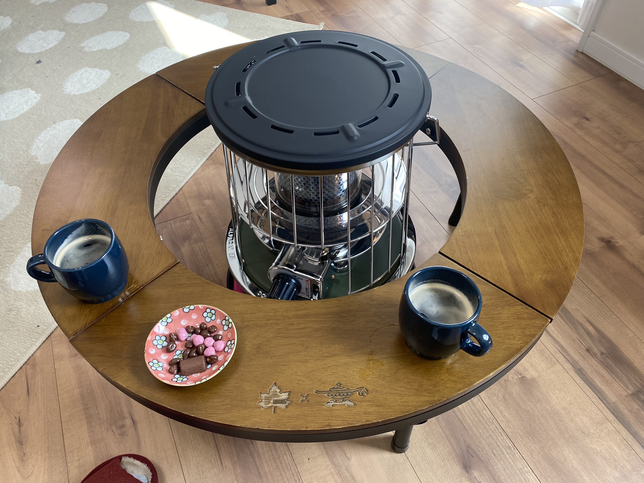 なくても困らないものではあるんですが、丸型テーブルは小型の石油ストーブとの相性が良くて雰囲気を演出してくれるので私はとても気に入っています。私が使っているのはロゴスとアラジンのコラボモデルで少しコンパクトです。通常モデルだと写真のものよりもう少し大きめです。