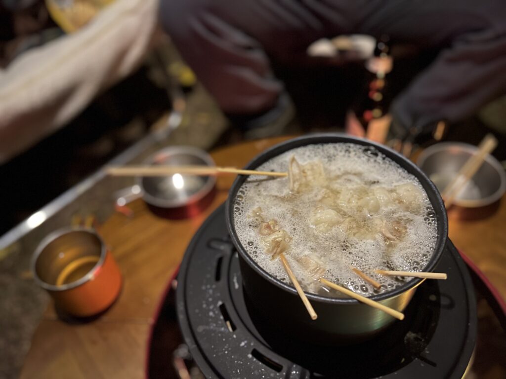 冬キャンプの夜は温泉で温まった後ストーブと丸型テーブルでおでんを囲むのが定番となっています。