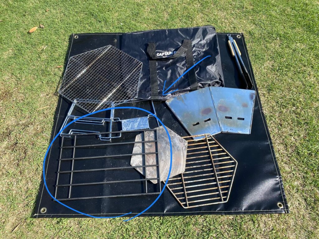 バッグのサイズに若干余裕があるため、私は火バサミとキャプテンスタッグのゴトクを同封しています。このゴトクは正式にはダッチオーブンスタンドなのですが、ファイアグリルMサイズにジャストフィットします。