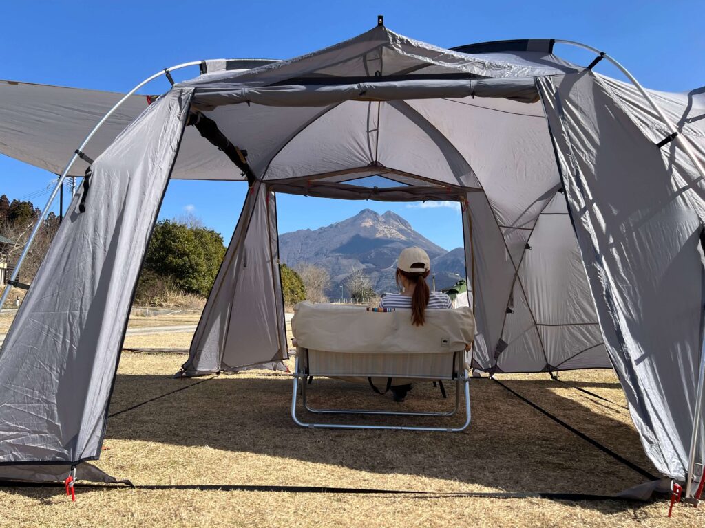 湯布院温泉ベースキャンプ場は湯布院インターを降りて10分ほどの場所にあります。アクセスしやすいにもかかわらず、豊かな自然に囲まれており由布岳を一望できます。2022年オープンということで施設も新しくて綺麗です。宿泊者は温泉入り放題です。