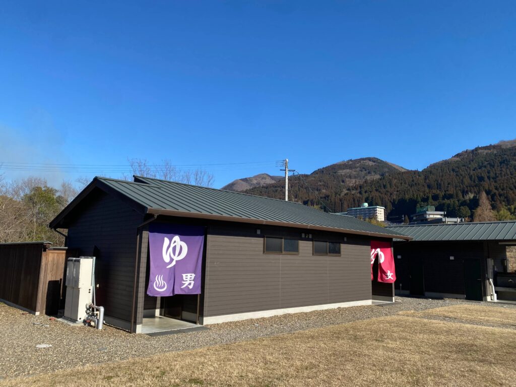 昼間の露天風呂は青い空に湯布院の景観と最高に癒されます。