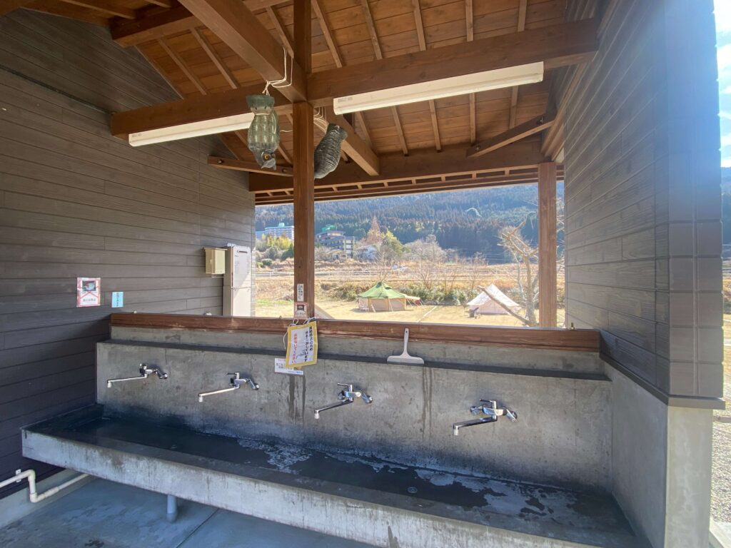 炊事場は綺麗で蛇口が計8つあります。炊事場からの見える湯布院の景色も綺麗です。
