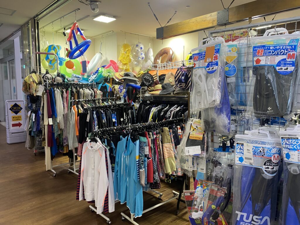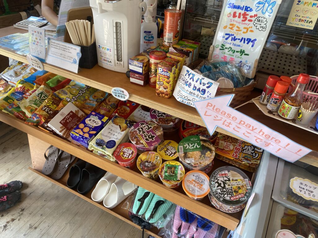 泊ふ頭ターミナルでは水着やシュノーケルセットが売っていました。ターミナル内にはローソンもありおにぎりやアルコール類も売っています。