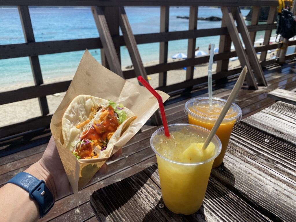 ビーチハウスには2件のご飯屋さんが入っていました。それぞれのお店でタコスとロコモコ丼を食べましたが、両方ともおいしかったです。そしてまたおしゃれです。カップ麺などのちょっとした小物も販売していました。アルコールの販売はありません。