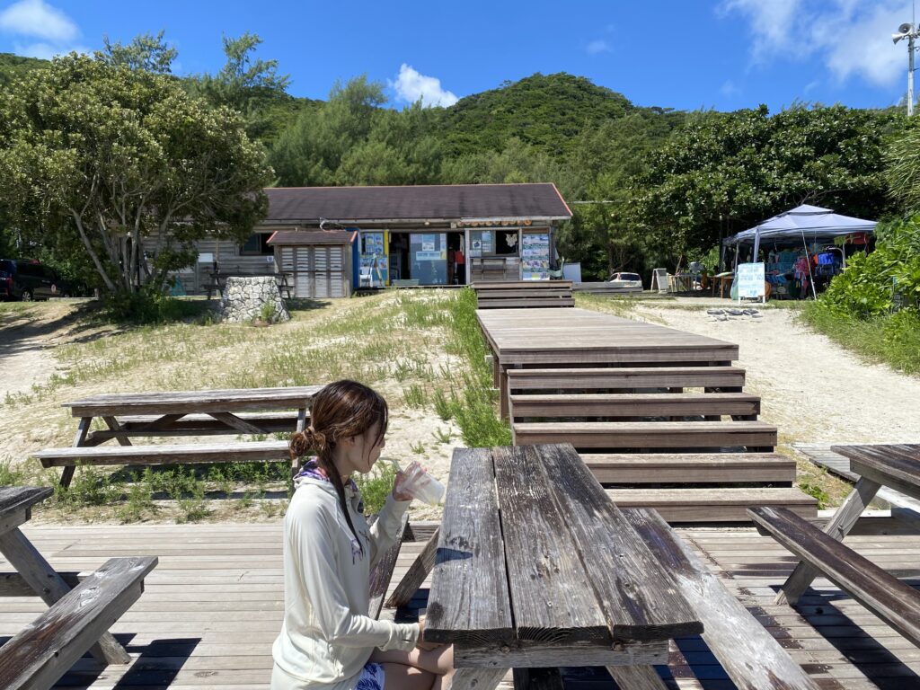 海の家の前には見晴らしの良い休憩スペースがあります。ここでみなさんご飯を食べたりくつろいだりしていました。海の家の中にも涼しい休憩スペースがありそちらで飲食することもできます。