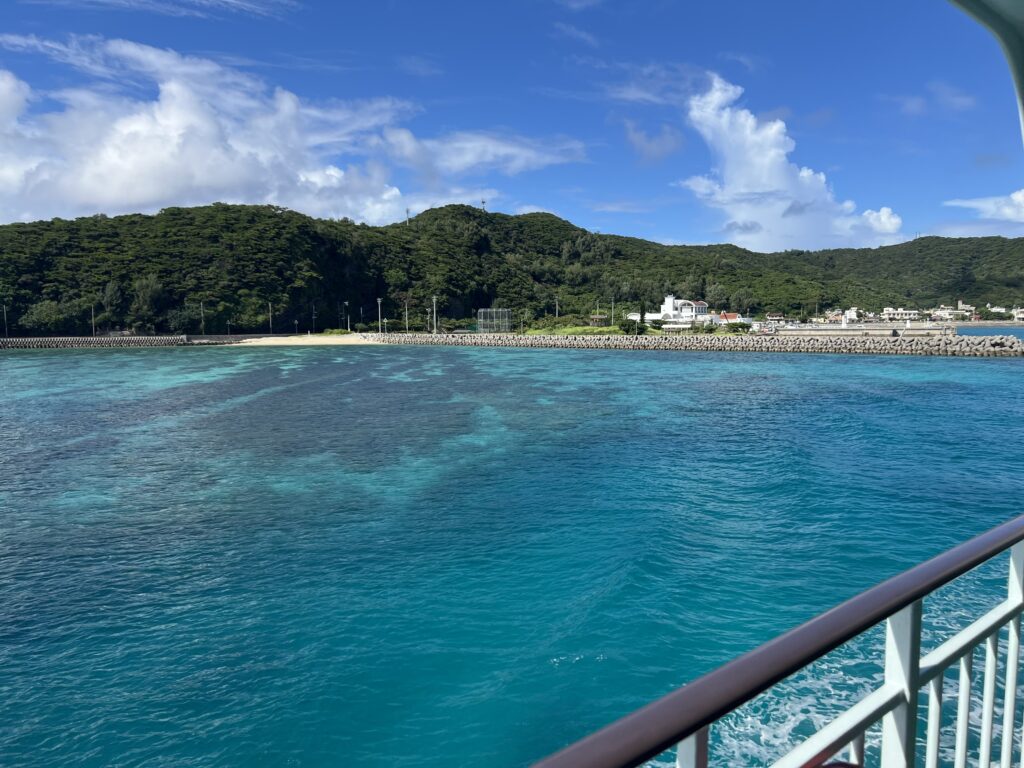今船中でレポートを書いているのですが、左側に渡嘉敷島が見えていますとても綺麗です。窓際の席にに座りたかった(涙)。船内でオリオンビールとさんぴん茶を飲みトイレがずっと空かなくてもぞもぞしている間にあっというまに座間味島に到着です。